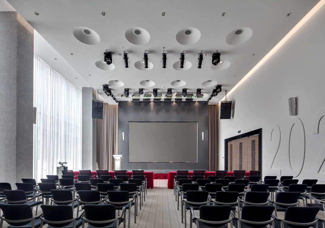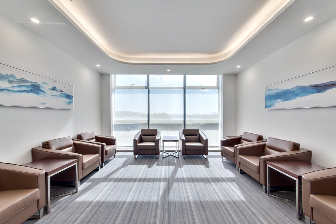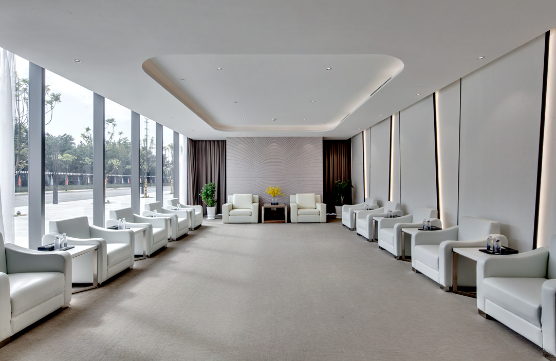 入口辦公前臺區(qū)墻面和前臺運(yùn)用幾何分割設(shè)計(jì),簡約的材料遇上瘋狂的切割,便會形成獨(dú)特的形態(tài),背景墻白色乳膠漆,前臺是白色石材,地面是灰色條紋地毯。同時(shí)銷售中心和辦公室墻面以白色乳膠、水泥板、黑色不銹鋼為主,地面木地板,灰色地毯為主,水吧區(qū)域,沙發(fā)用顏色去點(diǎn)綴,在空間節(jié)奏的變化、自然光影的引入和材料肌理的運(yùn)用,為至銷售中心和辦公室創(chuàng)造豐富和有趣的觀展體驗(yàn)。