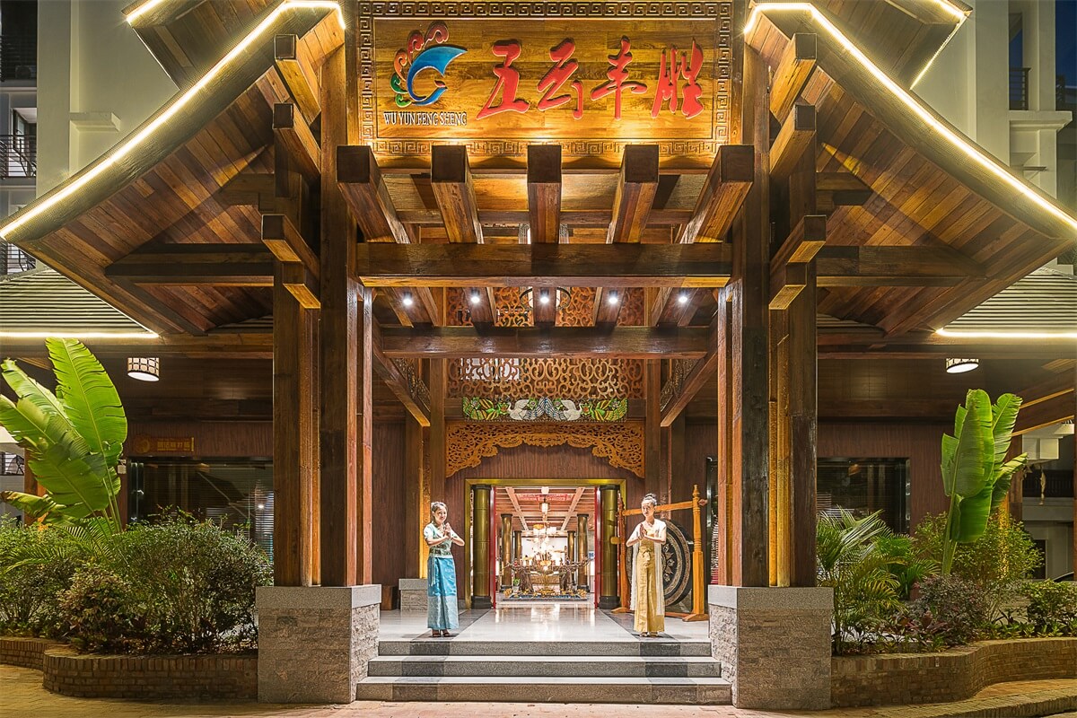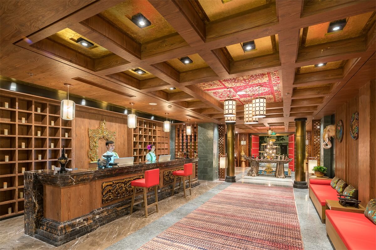 在大堂的設(shè)計(jì)上,整體以深褐色、金色、暗紅色為主,多選用實(shí)木材質(zhì)和金色的金屬,整個(gè)空間既穩(wěn)重,又能透出一種奢華之感。加上富有東南亞氣息的蓮花、孔雀及有佛教元素的擺件,使整個(gè)大堂也顯示出一種異域的神秘感。