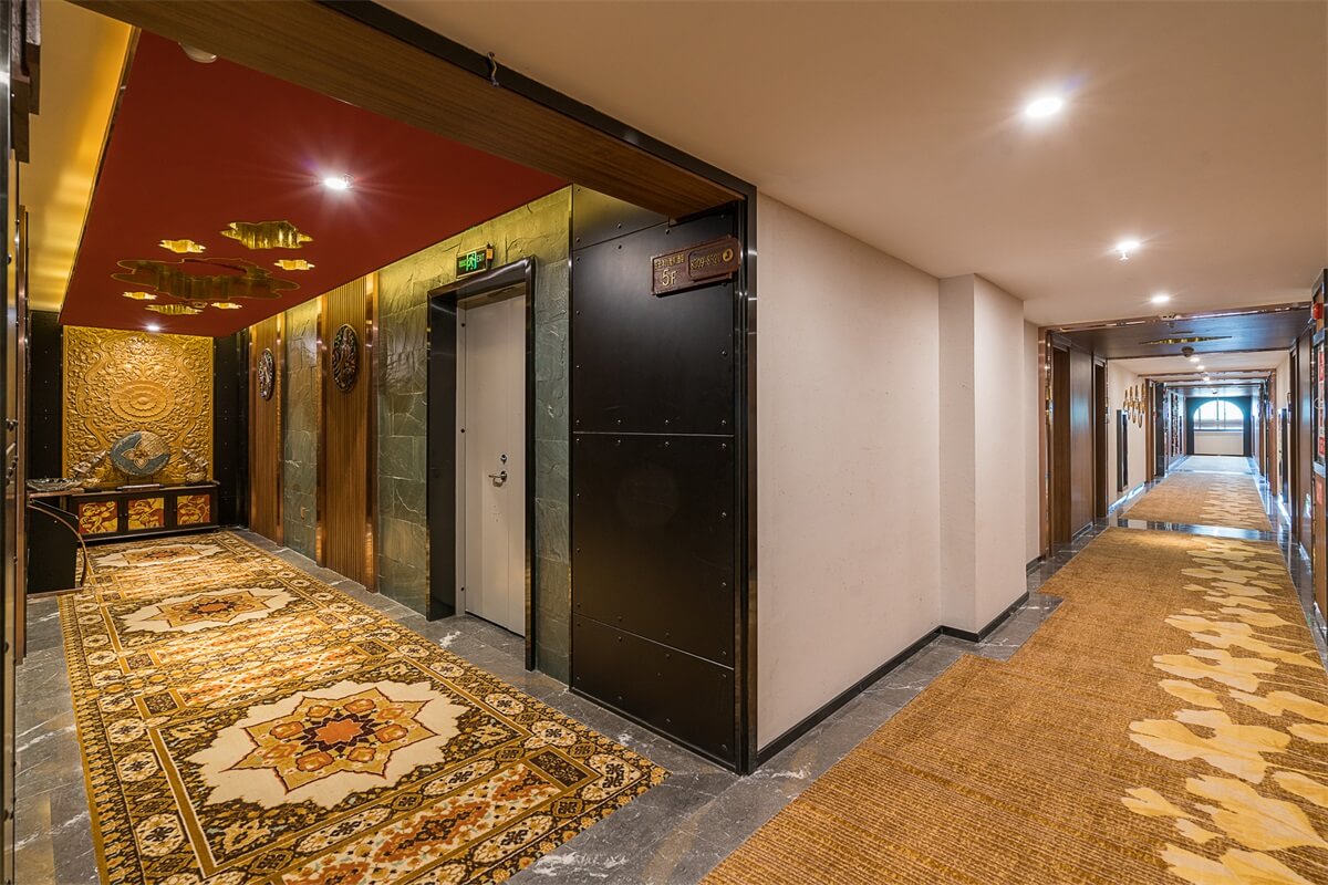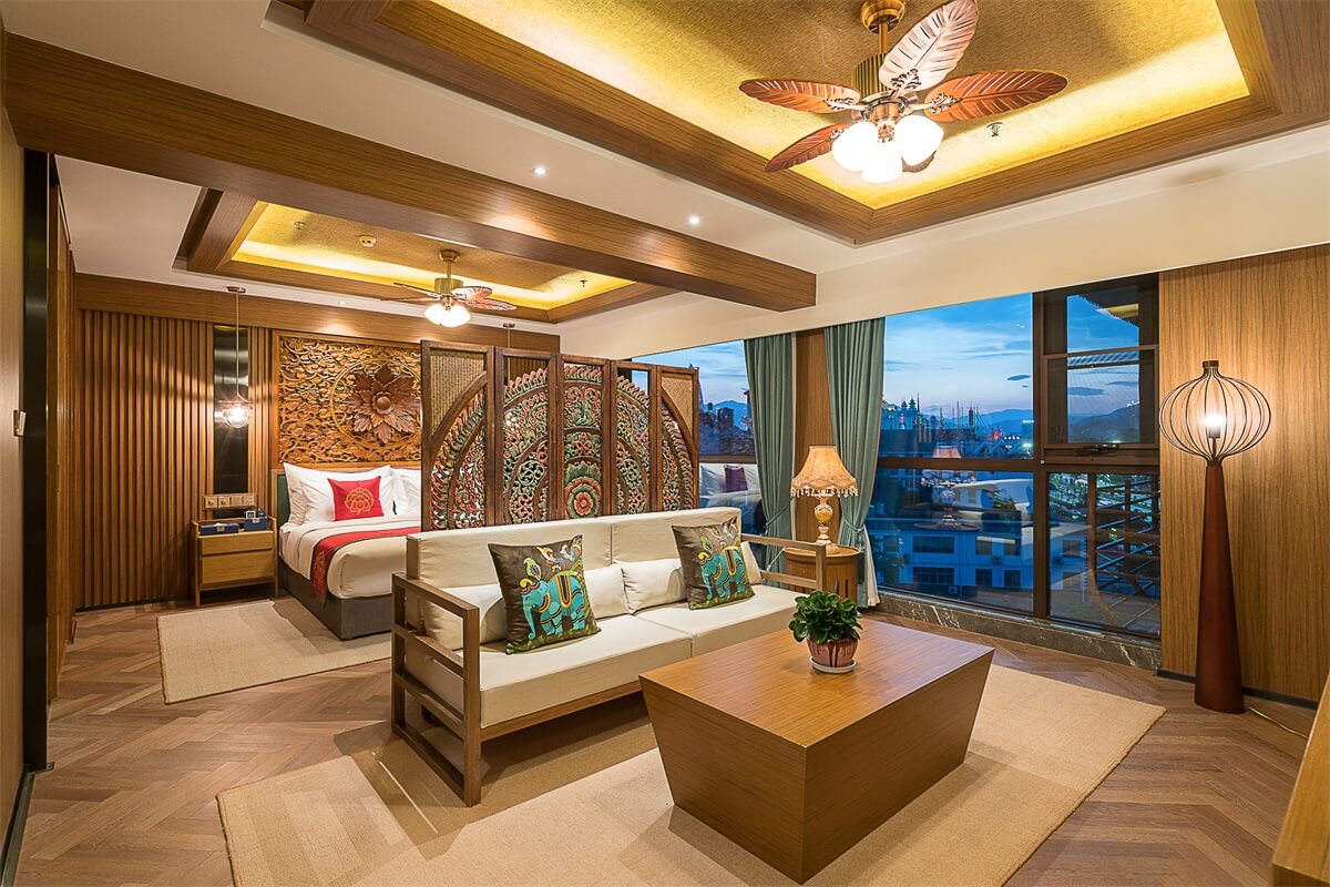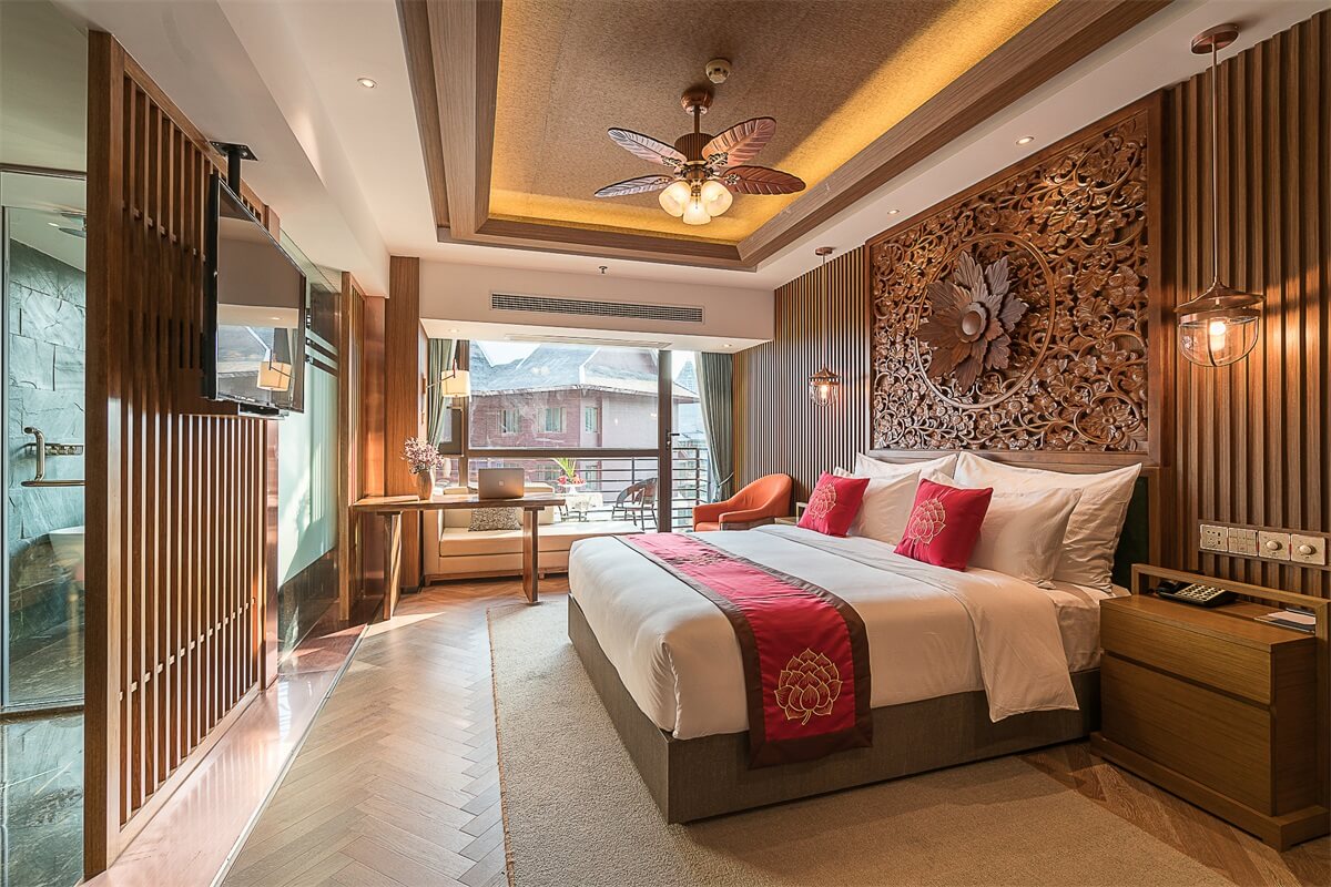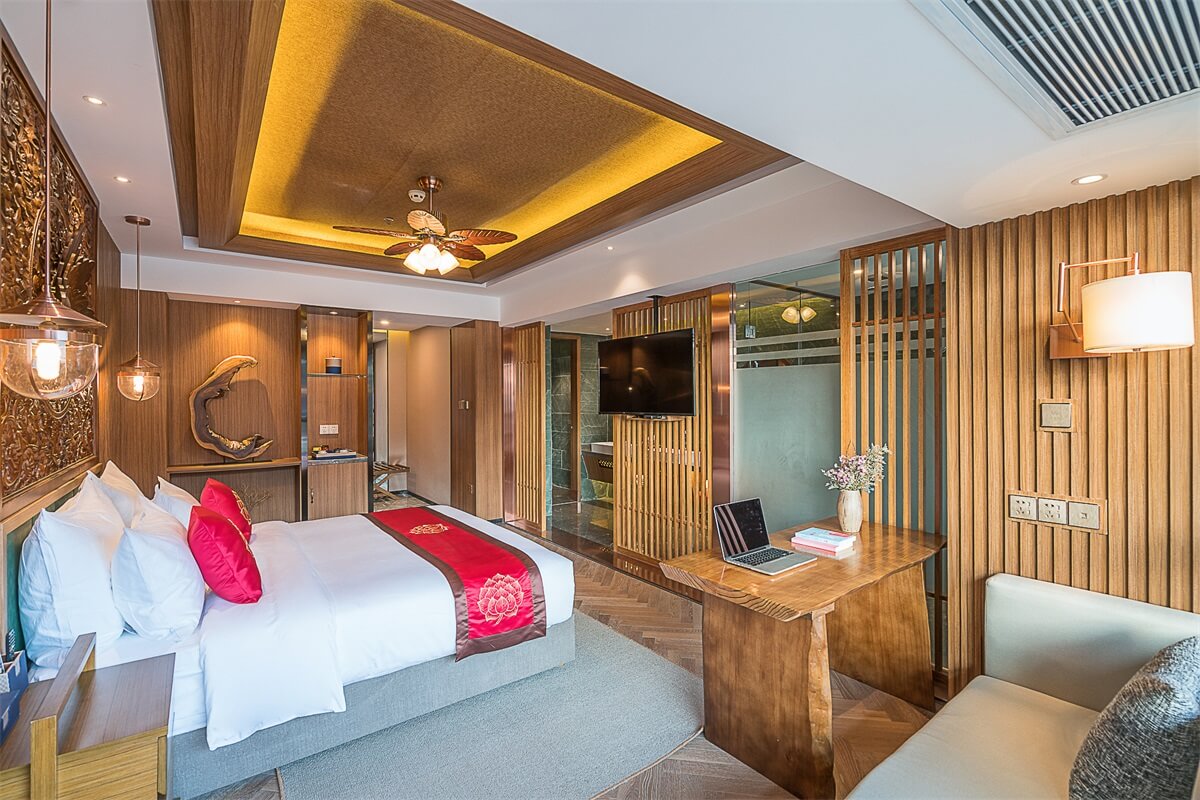 在電梯廳的設(shè)計(jì)上,紅色的天花、金色的墻體、金色的地毯,和整個(gè)酒店的泰式風(fēng)格相輔相成,在邊幾上擺放富有泰式風(fēng)情和佛教感覺(jué)的金色擺件,給人一種驚喜的感覺(jué)。在客房的設(shè)計(jì)上,地板、沙發(fā)、茶幾、屏風(fēng)、吊燈、臺(tái)燈、背景墻等都采用木材作為原材料,地毯則選用淺色系,給人回歸自然的寧?kù)o感。