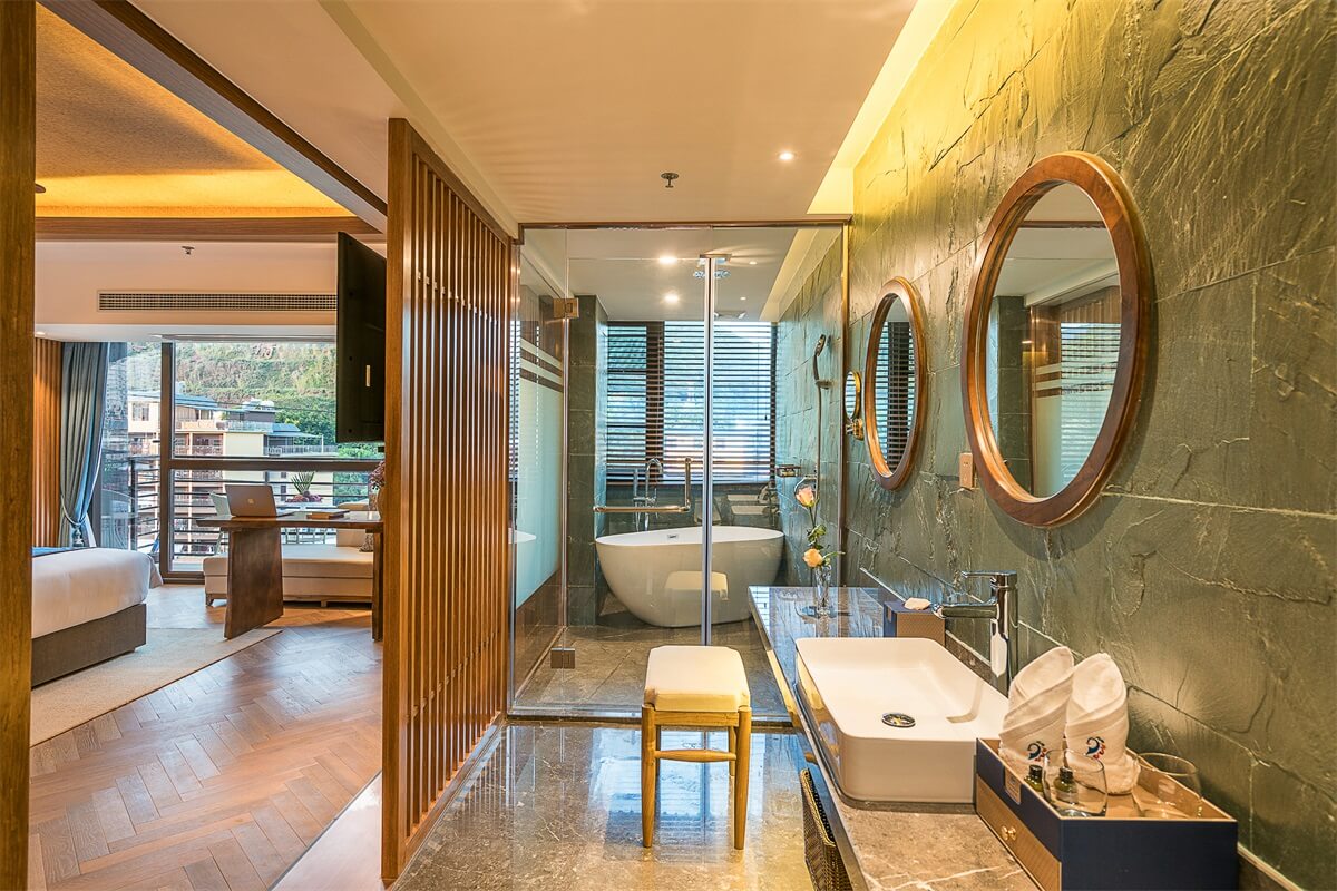 全日制餐廳,座椅選用泰式經(jīng)典藤椅,和同色系的竹桌相結(jié)合,給人一種置身于林間木屋的感覺(jué)。天花吸頂燈采用金色燈罩,和大堂色彩搭配一致。餐廳兩側(cè)配有泰式陶瓷藝術(shù)擺件,在細(xì)致的地方體現(xiàn)泰式風(fēng)格。餐具選用了簡(jiǎn)潔古樸的白瓷,放在簡(jiǎn)單的竹桌上,給人一種回歸自然、感受寧?kù)o的感覺(jué)。。